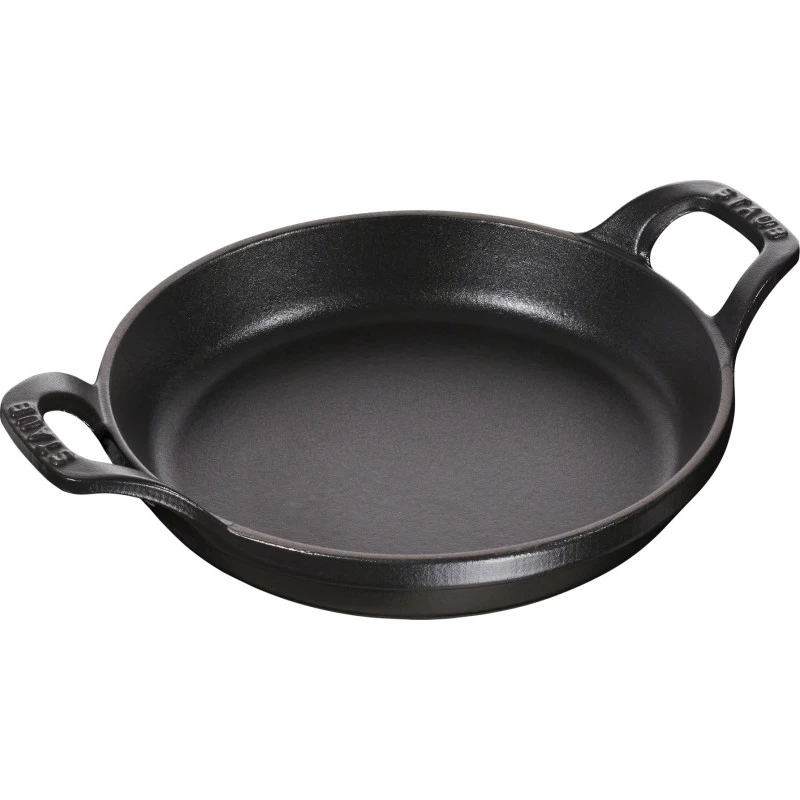 With a diameter of 12 cm and depth of 0.25 L, this round Staub mini gratin dish is ideal for making meals for one person or smaller portions. Its compact size and side handles make it easy to handle and take up very little space. This gratin dish can also be stacked up along with other gratin dishes from the same range, keeping your kitchen tidy and organised. This small, practical, attractive cast iron dish can be used to make gratins and oven-baked dishes on any heat source. Since cast iron retains heat well and distributes it evenly, this gratin dish is ideal for slow-cooked dishes. The matte black enamel on the inside helps heat spread evenly across the dish. The black dish also looks good when dishing up food at the table. This versatile gratin dish makes cooking and baking so much more enjoyable.