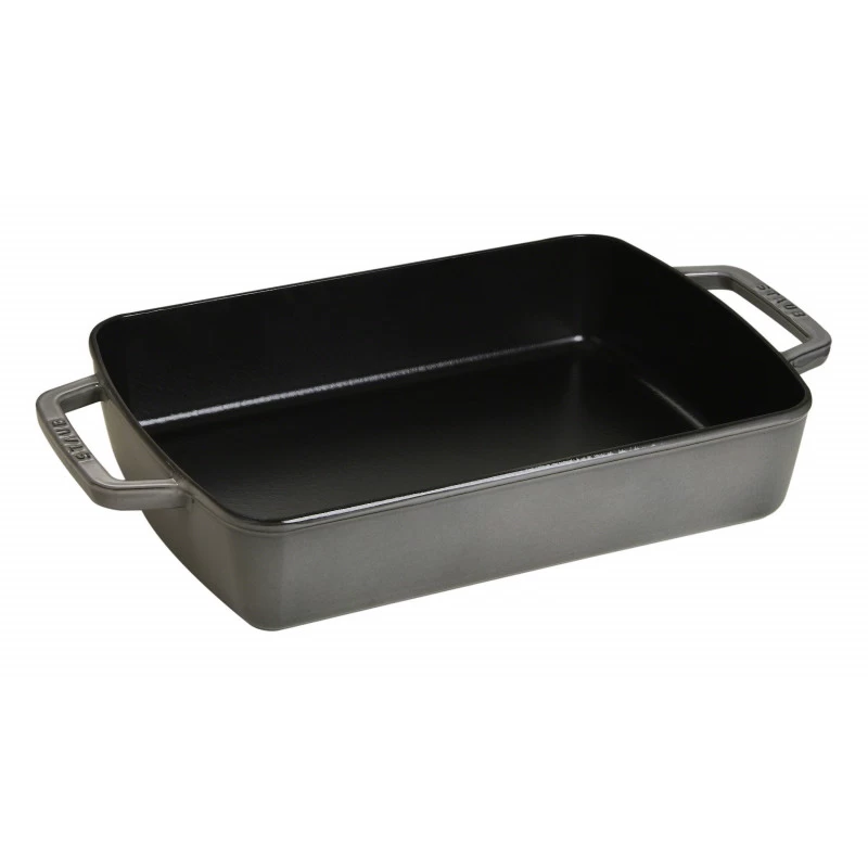 The sturdy side handles are also made of cast iron, are thus easy to grip, making it easier to lift and handle the dish when you need to put a bake or gratin into the oven or transfer it to the table for serving. The cookware dish can also be stacked on top of other dishes in the range to save space, thanks to its practical size and precise design. By opting for this stylish graphite grey Staub roasting dish, you will be adding a professional item of cookware to your kitchen that you can use to succeed with simple and even complicated recipes.