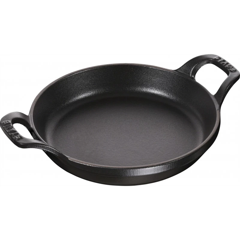 This round Staub roasting dish from its Cookware series is made of cast iron, guaranteeing even heat retention and release. Successfully sear meat, gently cook vegetables and produce a golden brown crust on a gratin in this roasting dish, as cast iron retains heat (and cold!) especially well. To keep your food cool, simply place your dishes in the refrigerator before serving. Top chefs, like Paul Bocuse, use the cast iron cookware because it is durable and easy to clean, among other reasons. The round roasting dish, which has a 20 cm diameter and holds 0.75 litres, can be practically stacked and is suitable for all types of cooker, including induction hobs. The cookware was designed to serve dishes directly from the oven or hob to the table. The appealing design of the black roasting dish from the Staub Cookware series gives your gratins a professional look reminiscent of top-class restaurant food. Please note dimensions are inclusive of handles.