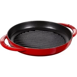 The cherry griddle pan is round in shape and has a diameter of 22 cm. It is made from cast iron and is therefore ideal for browning meat and sealing it to produce a crisp, brown exterior, while keeping the meat inside tender and succulent. This griddle pan is also perfect for frying steak, hamburgers and other meat dishes.