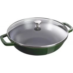 The round, basil wok is discreetly designed and ideal for serving up meals at any dining table. The cast-iron cooking utensil can be used for quick frying and gentle cooking to keep meat succulent and vegetables fresh and firm. The 30 cm diametre wok is also ideal for deep-frying and slow cooking.