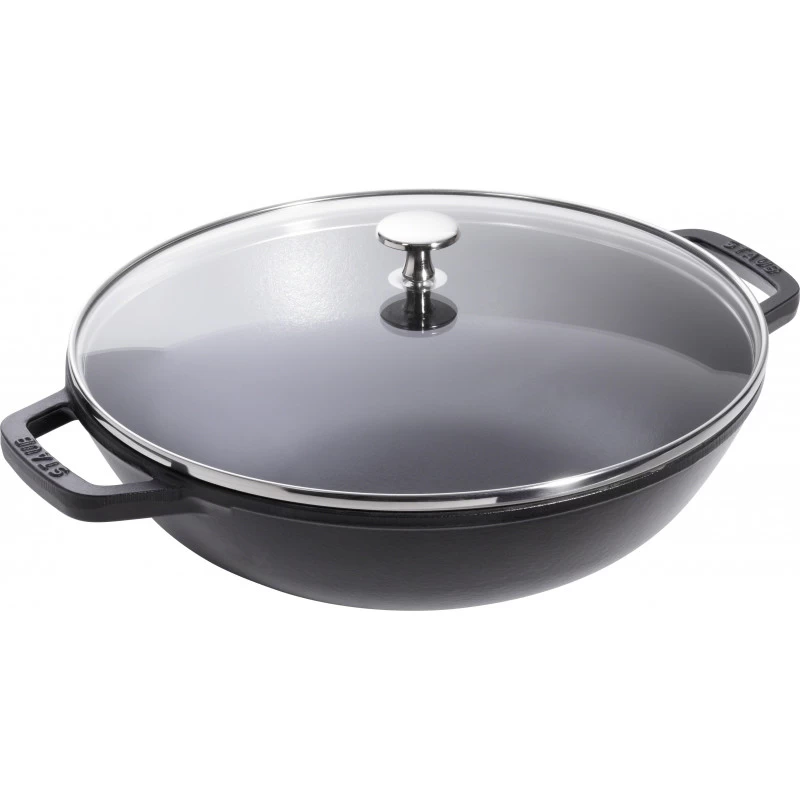 Cooking enthusiasts can reveal their hidden cooking talents with this cast iron black wok from Staub, as cast iron stores heat wonderfully and releases it steadily and evenly. It is perfect for searing meat and stir-frying vegetables, as well as for gently cooking them. Staub cast iron cookware also lends itself perfectly to braising, stewing and frying. A key feature of a wok is that the rim also heats up, transferring heat to the meat or vegetables when they are tossed and stirred. As these dishes are often fried and cooked very quickly, wok-cooking retains lots of nutrients in the food, above all keeping vegetables deliciously crunchy. Cast iron is also very scratch-resistant and durable. The wok is also extremely easy to clean so that frequent use of this cookware becomes a real pleasure. It is also suitable for use on all types of cooker, including induction hobs. Its 30 cm width and 12 cm height mean that it can even be popped into the oven when you need to keep something hot. The wok is round and comes in a black, sure to enhance every dining table. Serve your food directly from hob to table. As the cast iron releases the stored heat for longer, it is also possible to leave hot food standing on the table for a relaxing and leisurely meal with friends or family.