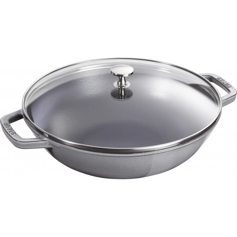 Cast-iron cookware from Staub can be used on any cooker including induction hobs. Two handles on the wok’s sides enable easy transfer to the oven for further cooking or for keeping food warm. A glass lid saves water and energy and provides a constant view of the cooking food. The lid has a practical knob to lift for stirring the food – the wok’s scratch-proof surfaces will cope!