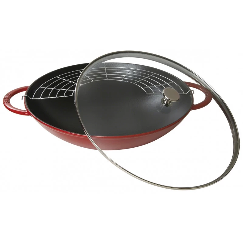 The wok is part of the Staub Speciality series and measures 37 cm in diametre and has a 5.7 l capacity. It is suitable for any cooker, and is equipped with a glass lid so that slow-cooking food can be observed at all times. By using this wok, you can cook a multitude of international recipes in a healthy and nutritious way.