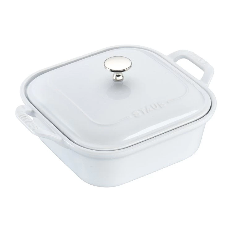 Rooted in French culinary heritage, Staub cookware is beloved by professional and home chefs for its exquisite craftsmanship, exceptional performance, and timeless beauty. Available in a rainbow of glass porcelain finishes, this ceramic cookware puts a pop of color in your kitchen. The porcelain enamel glaze prevents absorption of moisture during baking, so foods won’t dry out. Enjoy gooey mac n’ cheese, buttery apple crisp, and moist brownies every time. Extremely resistant to impact and thermal shock, this versatile pan easily goes from freezer to oven to table. With its chic, classic design, the Rectangular Covered Baking Dish allows you to serve up your dishes in style.