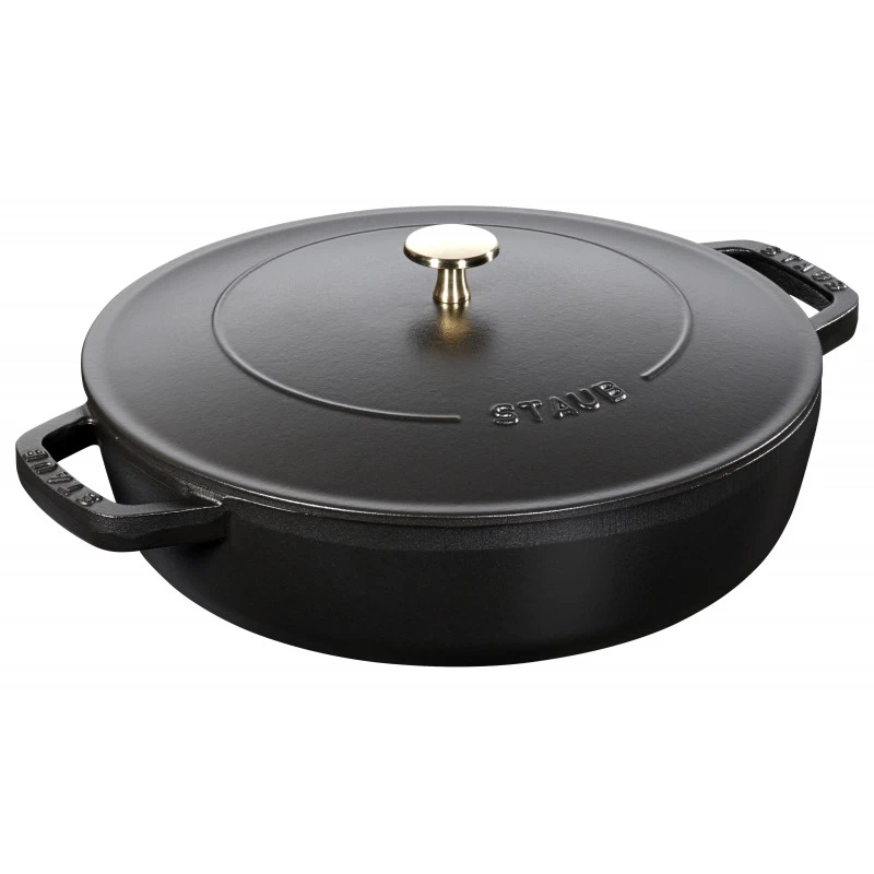 Whether you are preparing stew, beef bourguignon or ratatouille, you need a quality roaster for excellent results. With the Staub multifunction roaster you have an innovative cooking utensil at hand in which your meat will be tender and juicy, and vegetables retain their characteristic tastes, providing extra vitamins on the plate, due to the gentle cooking method. The multifunction roaster with Chistera drop structure is round and black. It can be used on all types of stove, including induction cookers and is oven safe. The roasting dish has a diameter of 24 cm, is 31.7 cm in length and 11, 6 cm tall with lid. It has a capacity of 2.4 litres.