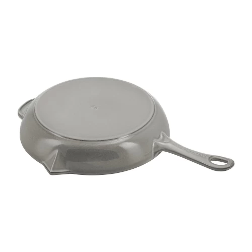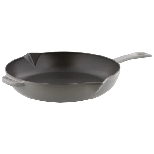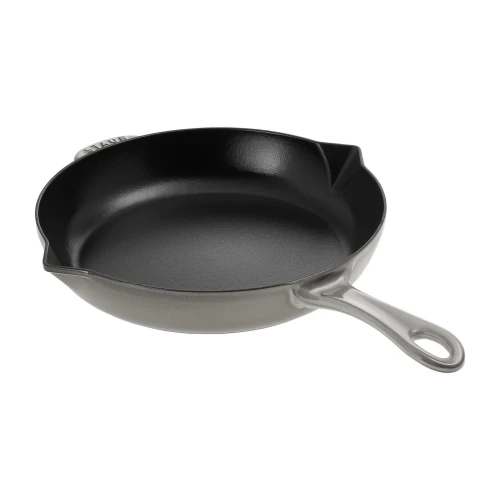 The Staub fry pan browns foods beautifully, be it chicken breasts, potatoes, or bacon. The enameled black matte interior imparts texture, promoting exceptional browning. Cast iron offers steady, even heat distribution, so the temperature of the pan won't drop as you cook. Low, curved sides make it easy to flip the food, which releases easily.