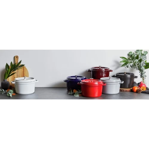 Like all STAUB Cocottes, the Tall Cocotte is made of enamelled cast iron, combining the advantages of cast-iron cookware with the benefits of high-quality enamel glaze: They are extremely durable and offer very even heat distribution. The special structure of the lid makes sure moisture is dropped back on the food for best results. The Tall Cocotte is 3 cm higher than the classic Cocotte, resulting in an added volume of 1 litre. This means you can cook larger quantities on a small burner, making sure all the surface of your Cocotte has contact with the hob for optimum energy efficiency. The slim form makes it easier to store in an average-size kitchen cupboard or fridge. With its added height, this Cocotte is especially well suited for deep-frying or searing food, protecting the cook and the kitchen from splattering hot oil. To make the most of the advantages of this Cocotte, try it with this kind of usages: recipes that require additional space, such as meat with bones like a roast crown of lamb, or stuffed bell pepper. Prepare your sauce first, then add your pasta al dente and serve, keeping it warm for a long timeFrying food without splattering oil all around your cooking areaCreating layered dishes that need space in height preparing a souffl