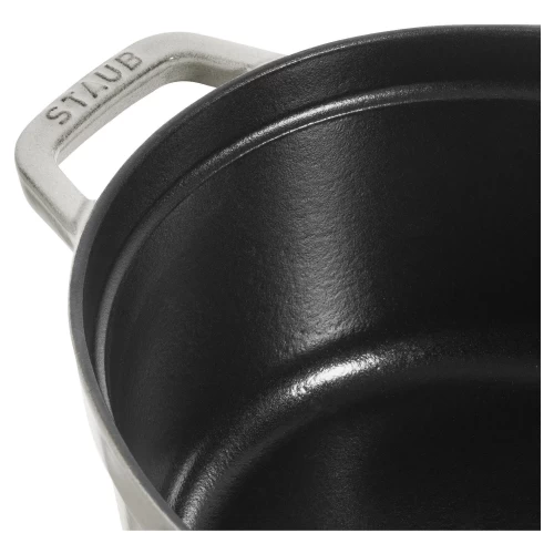 Leading chefs around the world are already convinced by the exceptional stewing properties of Staub cocottes. Thanks to its cast iron and enamel material combination, it retains heat very well and releases it evenly into your food. Cocotte casserole dishes were originally used in France to cook chicken and were handed down from generation to generation as they improve with each use. Nowadays, cocottes have so many more uses: they are ideal for cooking traditional stewed dishes, like goulash or ratatouille, as well as for tender roasts or aromatic, tasty vegetable dishes. A special ‘drip’ design in the lid ensures that any condensation produced is distributed evenly over the food, protecting it from drying out. The oval cocotte consists of graphite grey cast iron and has a matte black enamel coating on the inside, a material combination that produces even heat distribution. Nutrients are retained within the food, thanks to the aromas that are allowed to develop beautifully. The Staub casserole dish can be used on all kinds of heat sources, including induction hobs. With a diameter of 33 cm and a height of 17 cm, it hold 6.7 litres and is perfect for cooking and serving for the whole family or a group of friends. The durability and excellent stewing properties of the Staub cocotte will help you to cook and serve delicately tasting meals.
