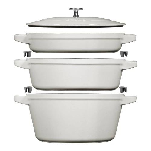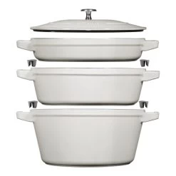 The set includes a 4.2QT/4L cocotte, a 3QT/2.9L braiser, a 9.5”/24cm skillet and a lid that can be used on each piece. Attachable rubberized bumpers are included to ensure each piece remains scratch-free when stacked and unstacked.