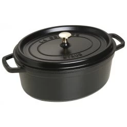 This black oval cocotte is made from enamelled cast iron. This combination of material is excellent at retaining heat which it then disperses gradually and evenly. Pots of this type are therefore ideal for the slow cooking of food to prevent the loss of nutrients. Enamelled cast iron is also ideal for bringing out the aroma of food to give your meals a distinctive flavour.
