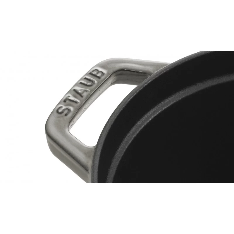 This graphite grey oval cocotte is made from enamelled cast iron. This combination of material is excellent at retaining heat which it then disperses gradually and evenly. Pots of this type are therefore ideal for the slow cooking of food to prevent the loss of nutrients. Enamelled cast iron is also ideal for bringing out the aroma of food to give your meals a distinctive flavour.