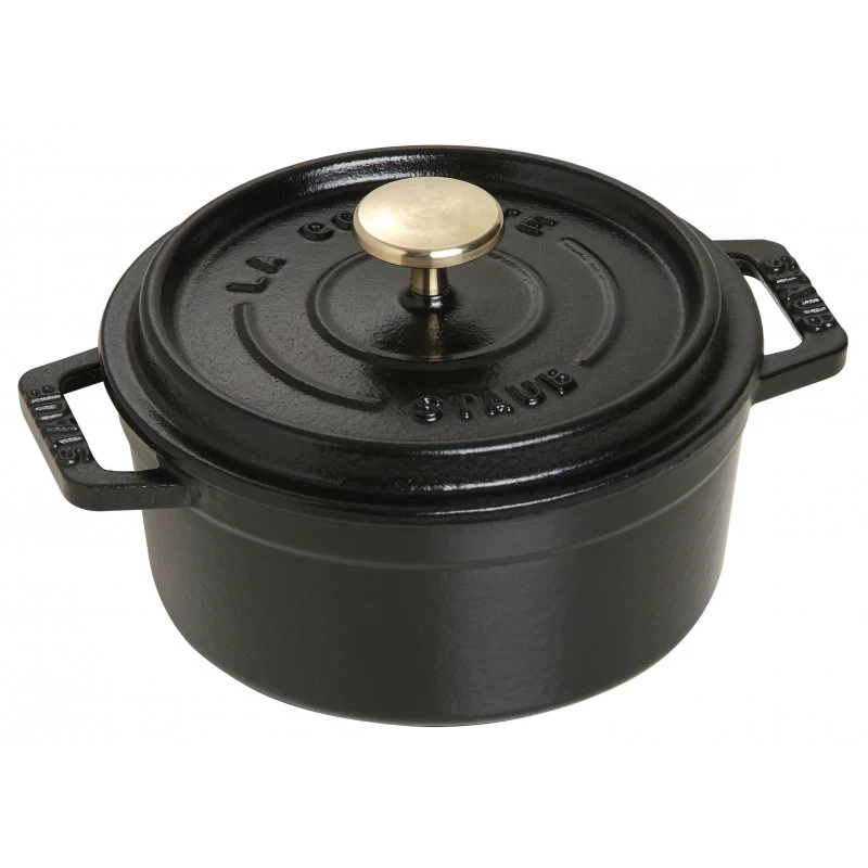 Cooking is a joy when using the round, black cocotte from the popular La Cocotte series. It looks good in any kitchen and dining area and will catch the eyes of your guests. Cocottes originate from France and are traditionally used for slow cooking. They are ideal not only for French specialties such as coq au vin, but also for other nation’s recipes. This Staub cocotte is around 8.7 cm high, 12 cm in diametre and has a 0.4 l capacity. It is made of cast iron, the ideal material for slow cooking. Cast iron retains heat for long periods and then gradually releases it during the cooking process. It is also very good at keeping food cold so is ideal for preparing desserts. Cast-iron cookware is suitable for any type of oven and cooker including induction hobs. It is robust, resistant and easy to care for. These features are enhanced in Staub cocottes through their enamelled interiors. Enamel also brings out the aroma of food to produce delicious meals. Ideal for searing and slow cooking of meat, fish or vegetables Juicy and tender cooking result thanks to the lid’s special drip structure The matt black inner enamelling is ideal for particularly crisp searing and is especially durable Suitable for all types of hobs, incl. induction, can also be used in the oven/grill