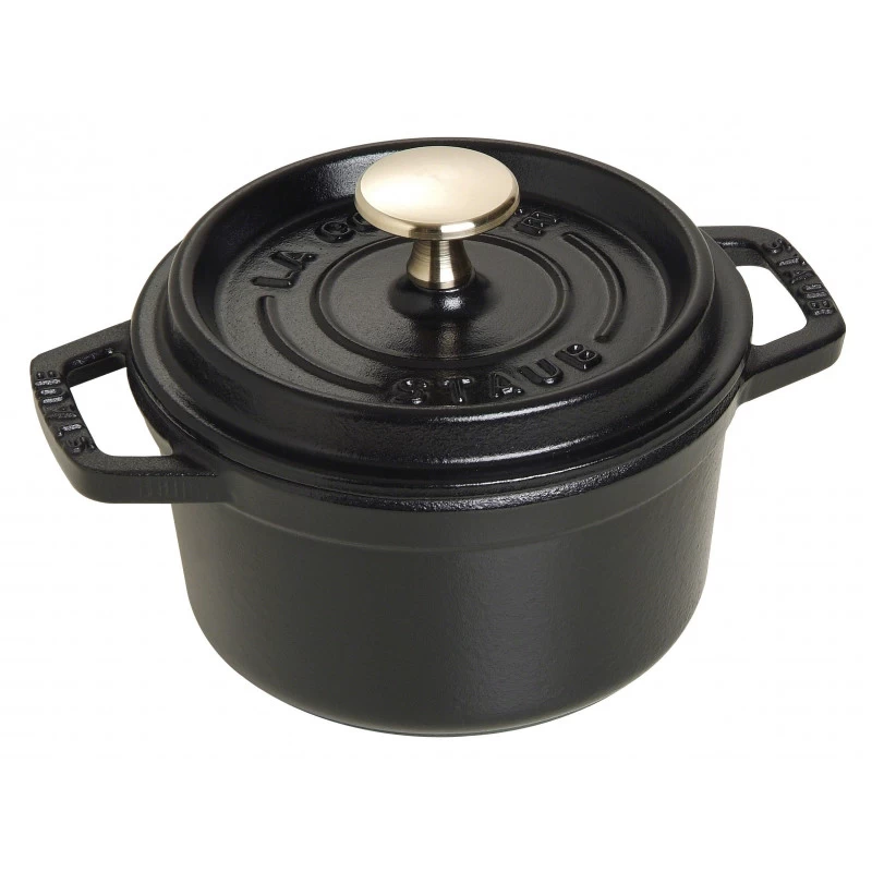 Cooking is a joy when using the round, black cocotte from the popular La Cocotte series. It looks good in any kitchen and dining area and will catch the eyes of your guests. Cocottes originate from France and are traditionally used for slow cooking. They are ideal not only for French specialties such as coq au vin, but also for other nation’s recipes. This Staub cocotte is around 12 cm high, 14 cm in diametre and has a 0.8 l capacity. It is made of cast iron, the ideal material for slow cooking. Cast iron retains heat for long periods and then gradually releases it during the cooking process. It is also very good at keeping food cold so is ideal for preparing desserts. Cast-iron cookware is suitable for any type of oven and cooker including induction hobs. It is robust, resistant and easy to care for. These features are enhanced in Staub cocottes through their enamelled interiors. Enamel also brings out the aroma of food to produce delicious meals. Ideal for searing and slow cooking of meat, fish or vegetables Juicy and tender cooking result thanks to the lid’s special drip structure The matt black inner enamelling is ideal for particularly crisp searing and is especially durable Suitable for all types of hobs, incl. induction, can also be used in the oven/grill