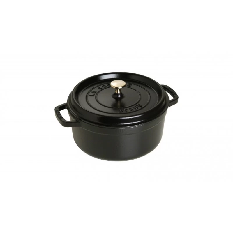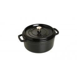 The black cocotte from the La Cocotte range is exactly the right choice for you, if you want to create stews, casseroles or desserts with assured success. With a diameter of 24 cm and a volume of 3.8 litres, the cocotte is big enough for hosting large dinner parties. Thanks to its colour, it also matches any type of cookware and dinnerware. The round Staub roaster is made of cast iron, which stores heat for a long time and slowly redistributes it. The cocotte is therefore particularly well suited for casserole recipes. The enamel coating reinforces this effect inside the cocotte and intensifies the food’s taste. That’s why even top chefs such as Paul Bocuse use Staub cocottes. The cast iron of the dish stores heat well, and heats up cooled food slowly. You can also use the cocotte for cold desserts. The cocotte is also very resilient and easy to care for. It is also suitable for all types of cookers, including induction cookers. Use the Staub cocotte to spoil your loved ones with delicious stews, which will remain warm at the table. Ideal for searing and slow cooking of meat, fish or vegetables Juicy and tender cooking result thanks to the lid’s special drip structure The matt black inner enamelling is ideal for particularly crisp searing and is especially durable Suitable for all types of hobs, incl. induction, can also be used in the oven/grill
