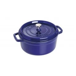The dark blue cocotte from Staub’s La Cocotte series can be used in almost any kitchen. The big advantage of the cocotte is that it can distribute and retain heat well thanks to its cast iron base material. With a capacity of 5.2 litres and a diameter of 26 cm, the round cocotte in dark blue is ideal for larger households or for use in the professional world.