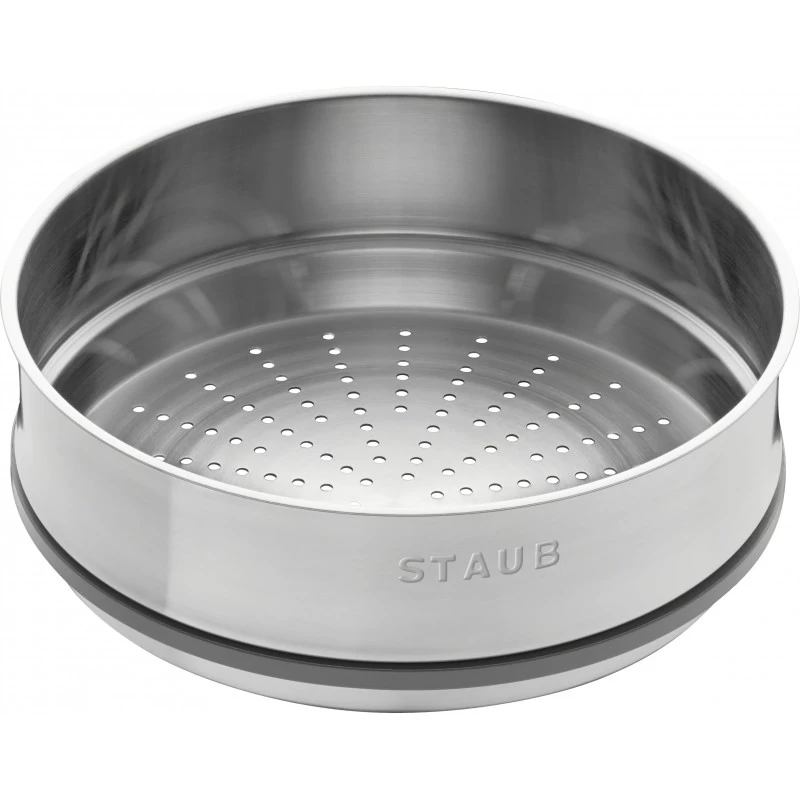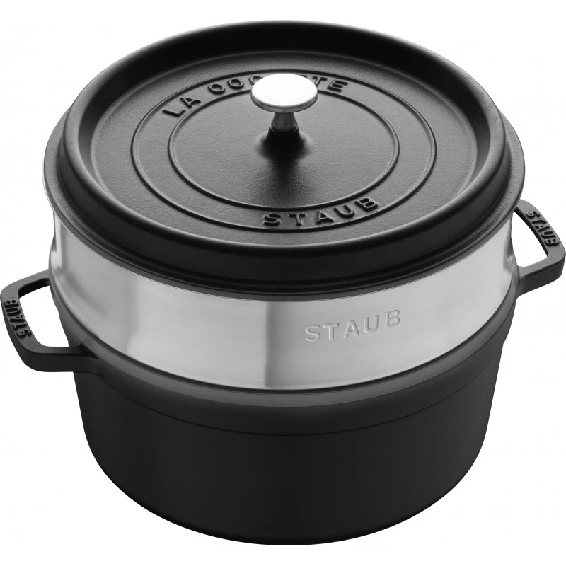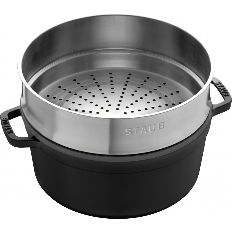 The black cocotte is round and has a diameter of 26 cm: it is made of cast iron with matt black enamelling on the inside. These two materials make this casserole dish outstanding for frying and slow cooking, as cast iron conducts heat very well and the enamel brings out the natural flavours of the food. The steamer insert is made of high-grade 18/10 stainless steel and has a silicone seal by means of which heat is ideally distributed.