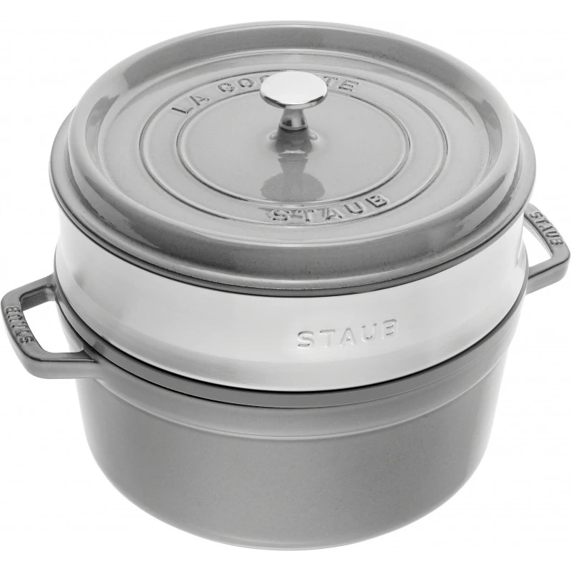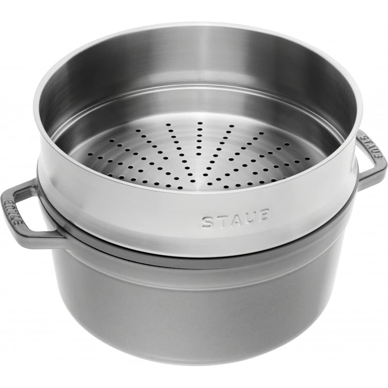 The graphite grey cocotte is round and has a diameter of 26 cm: it is made of cast iron with matt black enamelling on the inside. These two materials make this casserole dish outstanding for frying and slow cooking, as cast iron conducts heat very well and the enamel brings out the natural flavours of the food. The steamer insert is made of high-grade 18/10 stainless steel and has a silicone seal by means of which heat is ideally distributed.
